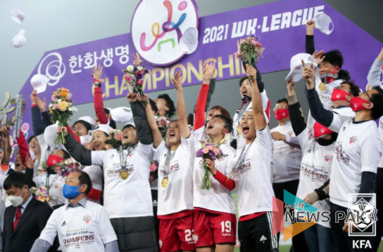 인천현대제철은 19일 오후 6시 인천남동구장에서 열린 한화생명 2021 WK리그 챔피언결정전 2차전에서 경주한수원에 1-0 승리를 거뒀다. 16일 경주한수원 홈에서 열린 1차전에서 1-1 무승부를 거뒀던 인천현대제철은 1, 2차전 합계 2-1 승리로 우승컵을 거머쥐었다. 2013년부터 정규리그 1위와 챔피언결정전 우승을 9년 연속으로 이뤄낸 대기록이다.