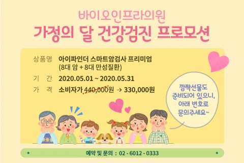 바이오인프라의원이 가정의 달을 맞아 5월 1일(금)부터 31일(일)까지 한 달간 프리미엄 아이파인더 스마트암검사를 할인가로 만나볼 수 있는 깜짝 이벤트를 실시한다.
