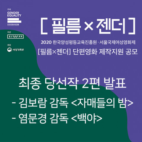 여성가족부 산하 한국양성평등교육진흥원(원장 나윤경)이 2020년 제2회 [필름×젠더] 단편영화 제작지원 공모(이하 공모) 당선작 2편을 29일(수) 발표했다.