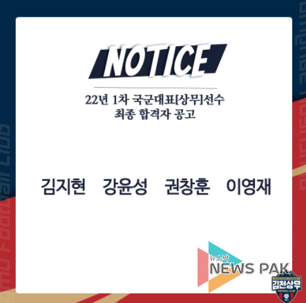 국군체육부대는 7일 오전 10시, ‘22년 1차 국군대표(상무) 운동선수(병)’ 최종합격자를 발표했다. 18명의 서류 합격자 중 최종 합격자는 권창훈, 강윤성, 김지현, 이영재 총 네 명이다.