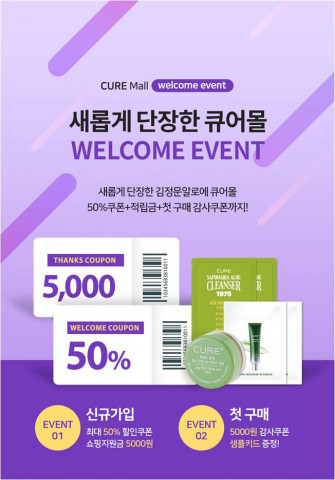 큐어 공식몰 신규 회원에게는 50% 할인쿠폰과 즉시 사용 가능한 쇼핑지원금 5000원을 지급하고, 첫 구매 후에는 5000원 감사쿠폰과 샘플 KIT가 증정된다.