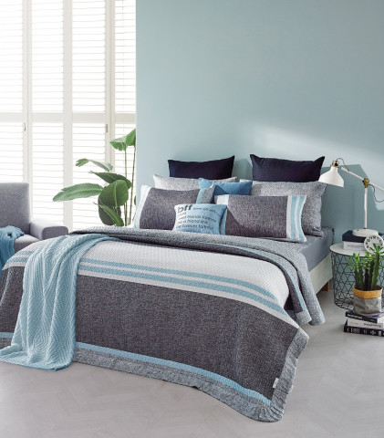 ‘리프앤’은 인견자카드 소재다. 목재펄프에서 추출한 인견은 여름철 땀 흡수력과 통풍력이 좋아 몸에 달라붙거나 끈적이지 않는다. 살에 닿는 느낌이 차가워 쾌적한 잠자리를 만들어주는 한여름 대표 소재다. 보태니컬(식물의 꽃, 잎 무늬) 트렌드를 반영해 자연의 내추럴한 감성을 표현했으며 그레이, 네이비 색상으로 모던함을 더했다. 또 광폭 원단으로 이음선이 없어 깔끔함이 돋보인다.