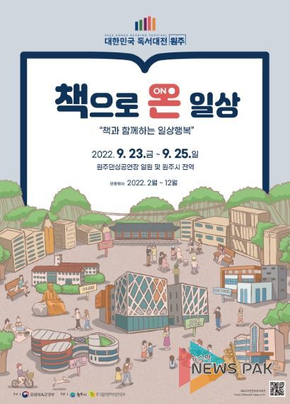 뉴스팍 이지율 기자 | 문화체육관광부는 원주시, 한국출판문화산업진흥원과 함께 국내 최대 규모의 독서문화 축제 ‘2022 대한민국 독서대전’을 ‘책으로 온(ON) 일상’이라는 주제로 9월 23일부터 25일까지 ‘2022 대한민국 책의 도시’ 원주에서 개최한다. 올해 9회째를 맞이한 독서대전에서는 9월 23일 오후 2시, 원주시 댄싱공연장에서 열리는 개막식을 시작으로 전시·공연·강연·학술·체험 등 7개 부문 30여 개의 다채로운 행사를 진행한다.