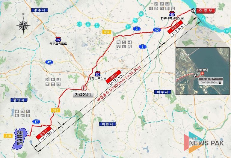 용인 반도체클러스터 공업용수는 여주시 남한강 여주보에서 취수해 이천시를 거쳐 총 36.9㎞에 이르는 관로(1500㎜)를 통해 일일 26만5000톤(1차분)이 공급될 예정이다.