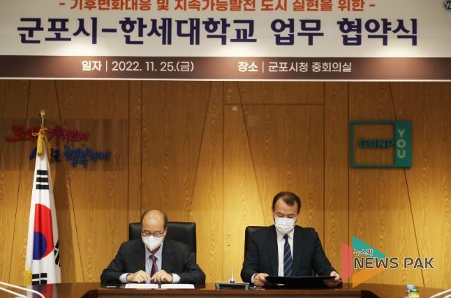 뉴스팍 진금하 기자 | 군포시는 지난 11월 25일 군포시청 중회의실에서 시 소재 학술기관인 한세대학교와 기후변화대응 및 지속가능발전 도시 실현을 위한 업무협약을 체결했다고 밝혔다.