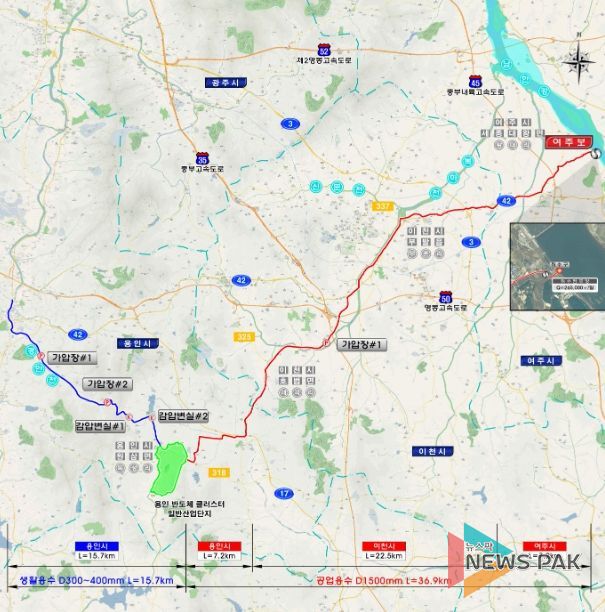 용인 반도체클러스터 공업용수는 하루 26만5000톤(1차분)이 공급된다. 공업용수가 이동하는 관로는 취수지점인 여주시 남한강 여주보에서 이천시를 거쳐 사업대상지까지 폭 1500㎜, 연장 36.9㎞로 설치된다.