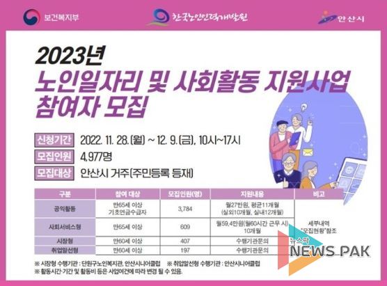 뉴스팍 진금하 기자 | 안산시는 ‘2023년 노인일자리 및 사회활동 지원사업’ 참여자 4천977명을 다음달 9일까지 모집한다고 29일 밝혔다.