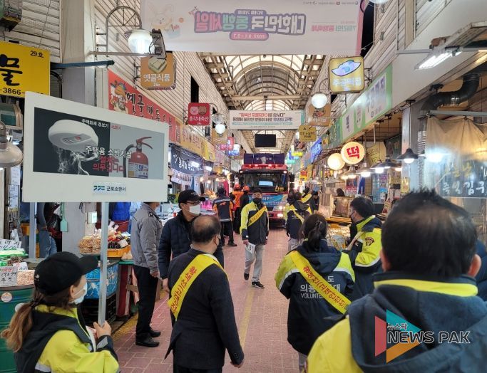뉴스팍 진금하 기자 | 군포시와 산본시장상인회는 29일 화재에 취약한 군포시 산본동 소재 전통시장인 산본시장에서 화재안전관리 강화를 위한 적치물경계선(소방통로, 황색선) 준수를 위한 캠페인을 실시했다.