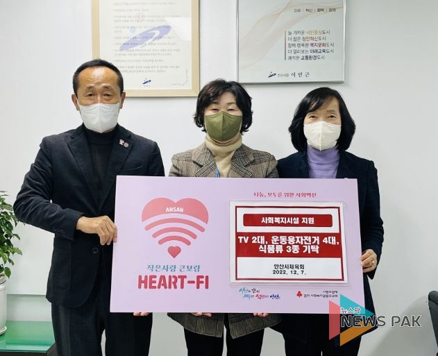 뉴스팍 진금하 기자 | 안산시는 지난 7일 안산시체육회로부터 사회복지시설을 위한 후원품(TV 2대·운동용 자전거 4대·음료수 4천개·초코파이,단백질바 각 1만2천800개)를 기탁받았다고 8일 밝혔다.