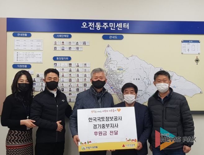 뉴스팍 진금하 기자 | LX 한국국토정보공사 경기중부지사는 지난 5일 의왕시 오전동주민센터에 이웃사랑기부금 100만원을 전달했다.