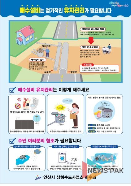 뉴스팍 진금하 기자 | 안산시는 공공하수도 관리 및 기능 향상을 위해 시민들에게 배수설비 설치와 정기적인 유지 관리를 당부한다고 12일 밝혔다.