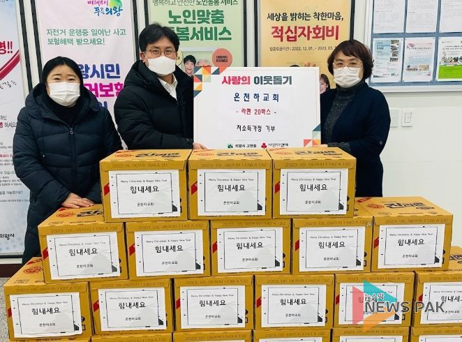 뉴스팍 진금하 기자 | 의왕시 왕곡동 소재 온천하교회는 지난 21일 취약계층을 위한 사랑의 라면 20박스(800개)를 고천동 주민센터에 전달했다.