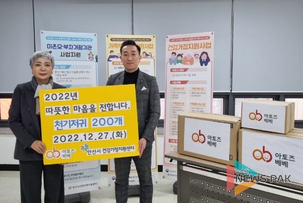 뉴스팍 진금하 기자 | 안산시 건강가정지원센터는 지난 27일 아토즈베베로부터 천기저귀 200개를 기탁받았다고 30일 밝혔다.