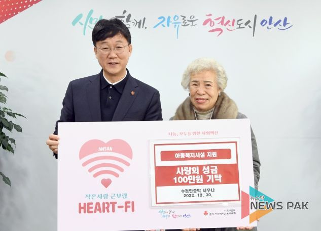 뉴스팍 진금하 기자 | 안산시는 30일 상록구에 위치한 수정한증막 사우나로부터 취약계층 아동을 위한 후원금 1백만 원을 기탁받았다.