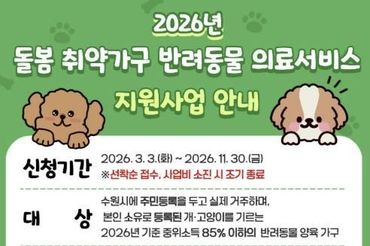 수원특례시, 돌봄 취약가구에 반려동물 의료서비스 지원