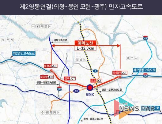뉴스팍 류은정 기자 | 용인특례시는 용인시민의 강릉 방향과 인천공항 방향 통행에 큰 도움이 될 제2영동고속도로 연결 ‘의왕~용인 모현~광주’ 고속도로 건설을 적극 추진하고 있다고 19일 밝혔다.