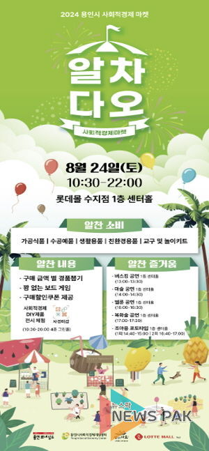 뉴스팍 류은정 기자 | 용인특례시는 오는 24일 수지구 성복동 롯데몰 수지점에서 지역의 사회적경제기업 26곳이 생산한 제품을 알리는 ‘마켓 알차다오’ 행사를 개최한다고 20일 밝혔다.