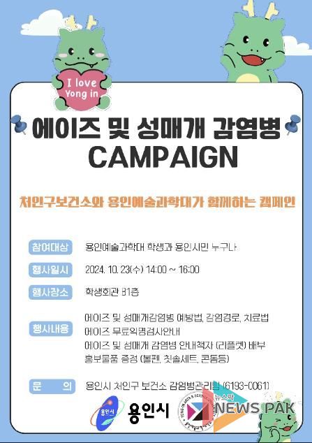 뉴스팍 배상미 기자 | 용인특례시 처인구보건소는 10월 23일 용인예술과학대 학생과 교직원, 시민을 대상으로 에이즈 예방캠페인을 진행한다.