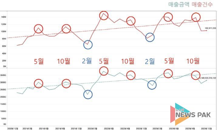 2021년부터 2023년까지 관광특구 해당 상권을 구역별로 세분화해 카드 매출 데이터를 분석한 결과 축제가 집중된 5월과 10월 매출액과 매출 건수가 증가하며 경제가 활성화되고 2월에는 다소 위축되는 경향이 매년 지속됐다. 발생 매출 건수는 2021년 일산호수공원 가로수길이 최다 매출을 기록했다. 2022년과 2023년에는 킨텍스 캠핑장이 최대 매출을 기록해 코로나 이후 캠핑산업이 활기를 찾으며 지역 경제 활성화에 기여하고 있는 것으로 나타났다.