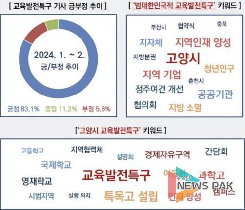 고양시가 올해 초 교육부가 추진하는 교육발전특구 시범지역으로 선정되며 관련 보도도 꾸준히 증가하고 있다. SNS 여론에서 고양시 양육 및 교육 환경 관심도 분석 결과 ‘교육발전특구’ 관련 보도에 긍정적 반응이 80% 이상을 차지하며 고양시 교육발전에 대한 시민들의 기대감이 높은 것으로 나타났다.
