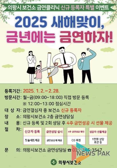 뉴스팍 류은정 기자 | 의왕시보건소는 새해를 맞아 시민들의 금연 성공을 돕기 위해 ‘2025년 새해맞이, 금년에는 금연하자!’ 특별 이벤트를 진행한다고 밝혔다.