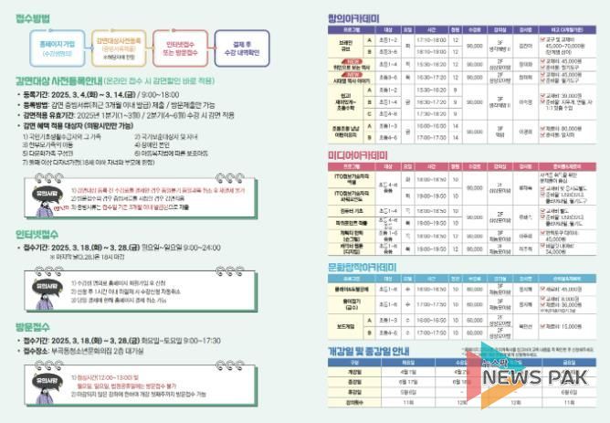 프로그램 접수는 3월 18일부터 28일까지이며 인터넷 및 방문 접수를 통해 진행된다. 감면대상자(기초생활수급자, 장애인, 다문화,한부모, 다자녀)의 사전 등록 기간은 3월 4일부터 14일까지다.