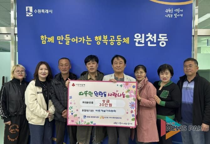 뉴스팍 배상미 기자 | 지난 25일, 수원시 영통구 원천동 바르게살기위원회가 지역사회의 나눔 문화 확산과 이웃사랑 실천을 위해 성금 30만 원을 기부했다.
