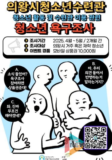 뉴스팍 류은정 기자 | 의왕시청소년재단 의왕시청소년수련관 소속 청소년운영위원회 ‘그린나래’가 ‘청소년 활동 욕구조사 및 수련시설 이용 만족도조사(이하 청소년 욕구조사)’를 실시한다.