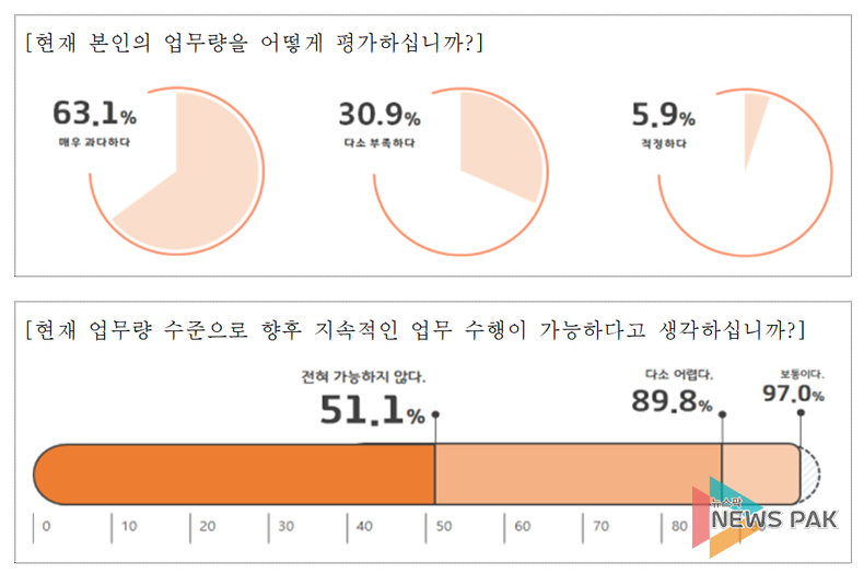 경기신보 근로자의 94.1%는 현재 업무량이 과도하다고 응답했으며, 98.3%는 정원이 부족하다고 느끼고 있었다. 아울러 직원 10명 중 7명은 과도한 업무로 인해 퇴직이나 휴직을 진지하게 고려한 적이 있으며, 현재 업무량으로 향후 지속적인 업무수행이 가능하다고 응답한 비율은 단 3%에 불과했다.