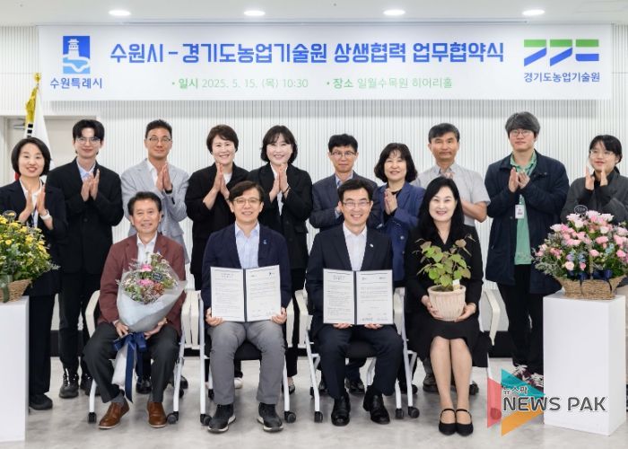 뉴스팍 배상미 기자 | 수원시와 경기도농업기술원이 15일 일월수목원 히어리홀에서 ‘원예 기술 분야 네트워크 구축을 위한 상생협력 업무협약’을 체결하고 협력을 약속했다.