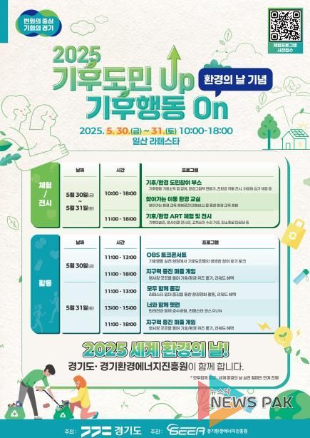 뉴스팍 배상미 기자 | 경기도와 경기환경에너지진흥원은 ‘2025 세계 환경의 날(6월 5일)’을 기념해 오는 5월 30일부터 31일까지 고양시 일산 라페스타에서 ‘2025 기후도민 UP, 기후행동 ON’ 현장 체험행사를 개최한다.