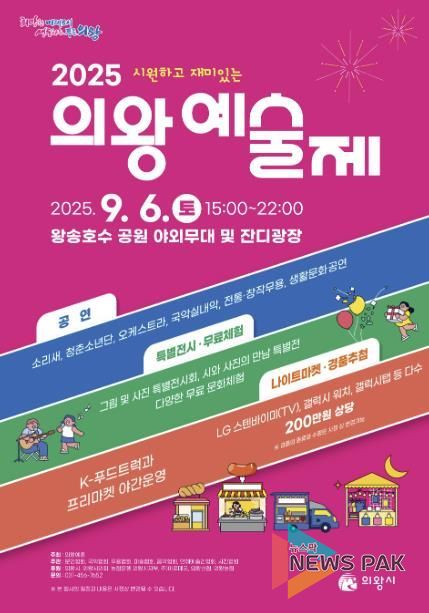 뉴스팍 배상미 기자 | 의왕시는 (사)한국예술문화단체총연합회 의왕지회에서 주관하는 '2025 의왕예술제'가 9월 6일(15:00~22:00) 왕송호수공원에서 개최된다고 밝혔다.