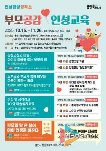 뉴스팍 배상미 기자 | 용인특례시(시장 이상일)는 부모의 자기이해와 감정 돌봄을 통해 자녀의 인성 발달을 지원하고, 가족 내 공감적 소통을 촉진하기 위한 ‘부모 공감 인성교육’을 10월부터 11월까지 운영한다고 24일 밝혔다.