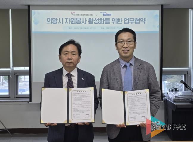 뉴스팍 배상미 기자 | (사)의왕시종합자원봉사센터는 현대로템(주)과 9월 23일 센터 교육장에서 자원봉사 활성화를 위한 업무협약(MOU)을 체결했다.