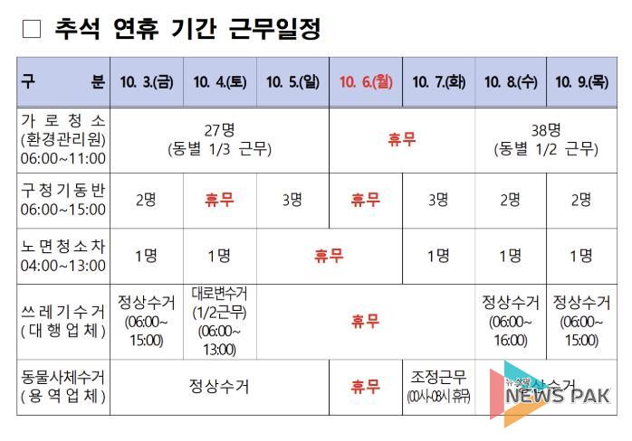 10월 3일부터 9일까지 이어지는 이번 추석 연휴 기간 중 발생되는 적치 쓰레기를 해소하고 청소 관련 민원을 신속하게 처리하기 위하여 동별 청소 인력 배치 및 청소 기동반 운영 등 주민 불편 최소화에 초점을 맞춰 추진된다.