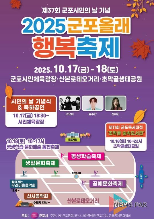뉴스팍 배상미 기자 | 군포시는 제37회 시민의 날을 기념하여 오는 10월 17일부터 10월 18일 양일간 군포올래 행복축제를 개최한다.