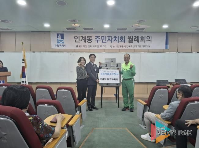 뉴스팍 배상미 기자 | 수원시 팔달구 인계동 주민자치회는 지난 10월 1일, 가을철 관내 낙엽청소용 송풍기 벨트(100만 원 상당)를 인계동 행정복지센터에 전달했다.