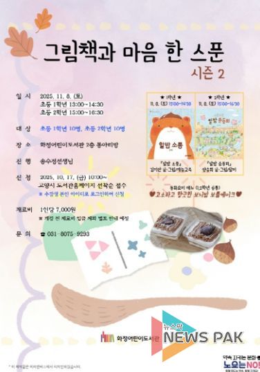 뉴스팍 배상미 기자 | 고양특례시 화정어린이도서관은 오는 11월 8일 ‘고소하고 향긋한 보늬밤 보틀케이크’를 만들어보는 그림책 동화요리 프로그램‘그림책과 마음 한 스푼-시즌2’를 운영한다.