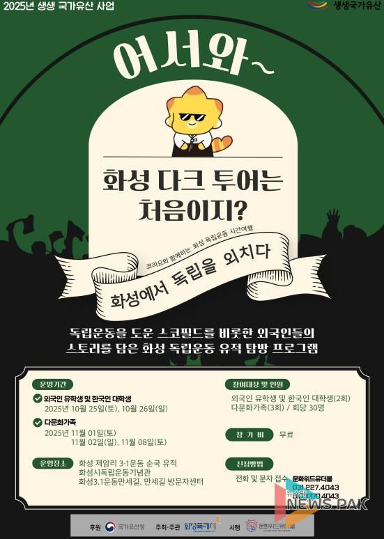뉴스팍 류은정 기자 | 화성특례시가 오는 25일부터 ‘2025 우리고장 국가유산 활용사업(생생문화재)’의 마지막 프로그램인 ‘어서와~ 화성 다크 투어는 처음이지?’를 운영한다.