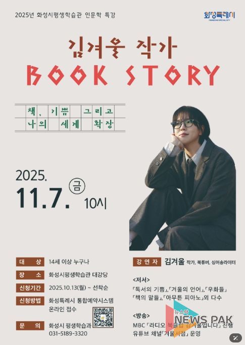 뉴스팍 류은정 기자 | 화성특례시는 오는 11월 7일 오전 10시, 화성시평생학습관에서 김겨울 작가를 초청해 인문학 특강을 개최한다고 밝혔다.