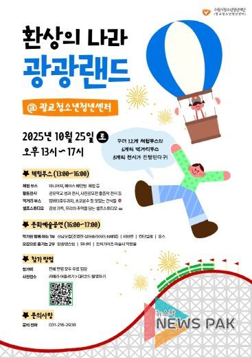 뉴스팍 배상미 기자 | 수원시청소년청년재단(이사장 최종진) 광교청소년청년센터는 오는 10월 25일 오후 1시부터 5시까지, 청소년·청년 및 지역주민을 위한 가을맞이 축제 ‘환상의 나라 '광광(光光)랜드'’행사를 개최한다고 밝혔다.