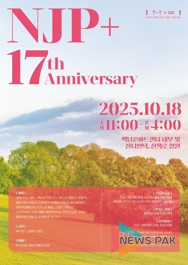 뉴스팍 배상미 기자 | 경기문화재단 백남준아트센터(NJP, 관장 박남희)는 2025년 10월 18일, 개관 17주년 기념 축제 'NJP+'를 연다. 특히 이번 행사는 백남준아트센터와 경기도박물관, 경기도어린이박물관으로 이어지는 산책로 환경개선과 맞물려 축하의 의미를 더하고 있다. 아트센터는 올해 시민 예술 교육프로그램인 ‘퍼블릭 아카데미’ 운영, 지역 연계 협력 축제인 ‘제8회 머내마을영화제’ 공동체 상영관 참여, 유휴부지에 공유 정원을 조성하는 ‘이키로(2km) 정원행동 캠페인’ 등 지역과 환경을 잇는 새로운 고객서비스 프로그램을 기획·추진하고 있다.