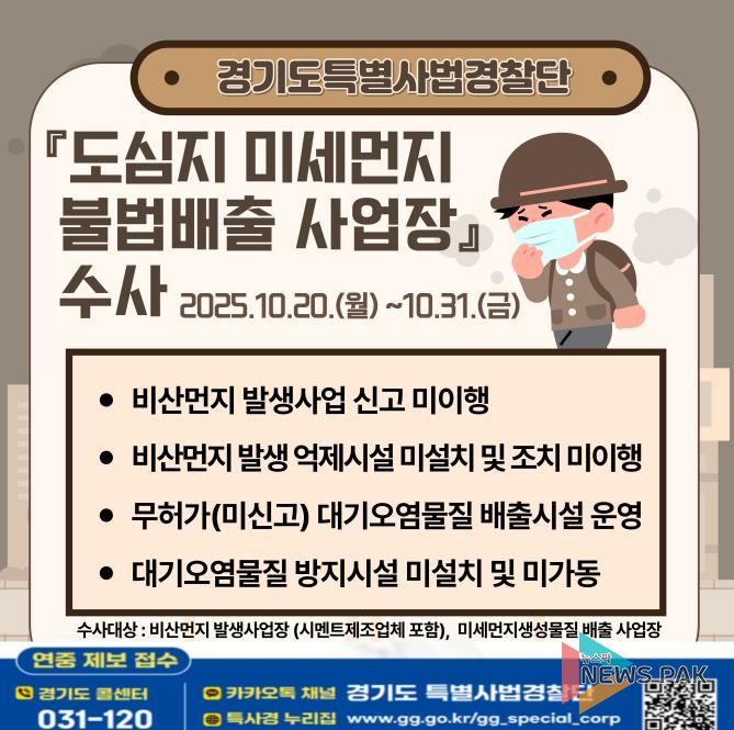 뉴스팍 배상미 기자 | 경기도 특별사법경찰단은 오는 20일부터 31일까지 2주간, 도심지 내 미세먼지 주요 발생 사업장을 대상으로 불법행위를 집중 수사한다.