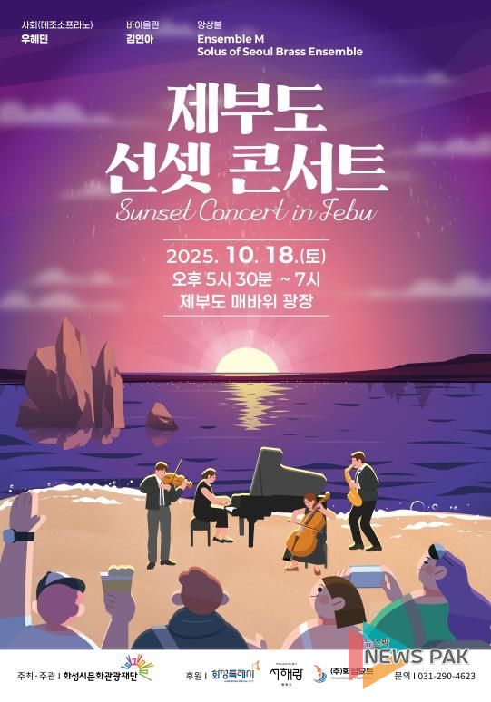뉴스팍 류은정 기자 | 화성시문화관광재단은 아름다운 서해의 석양을 배경으로 클래식 공연 ‘제부도 선셋 콘서트(Sunset Concert in Jebu)’를 오는 10월 18일 5시 30분 제부도 매바위 광장에서 개최한다. 이번 공연은 제부도를 단순 방문지를 넘어 머무는 체류형 관광지로 전환하고, 서해안 관광 활성화의 기반을 마련하는 데 목적이 있다.