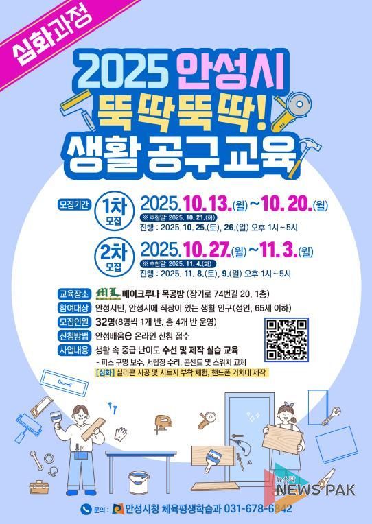 뉴스팍 배상미 기자 | 안성시는 시민들의 생활 자립 역량 강화를 위해 '뚝딱뚝딱 생활 공구[심화과정] 교육'을 오는 10월 25~26일과 11월 8~9일, 총 2회 주말 일정으로 운영한다고 밝혔다.