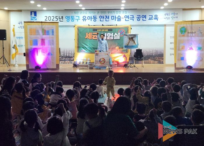 뉴스팍 배상미 기자 | 수원시 영통구는 2025. 10. 13. 영통구청 대회의실에서 관내 유아를 대상으로 안전한 위생 습관을 형성하기 위한 ‘찰리박사의 세균실험실’ 체험형 안전마술·연극 공연 교육을 실시했다.