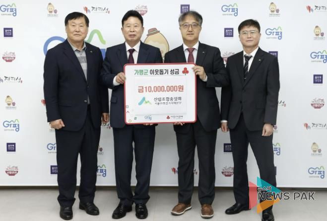 뉴스팍 배상미 기자 | 산림조합중앙회 서울인천경기지역본부는 13일 가평군청을 방문해 지역의 어려운 이웃을 돕기 위한 성금 1천만 원을 기탁했다.