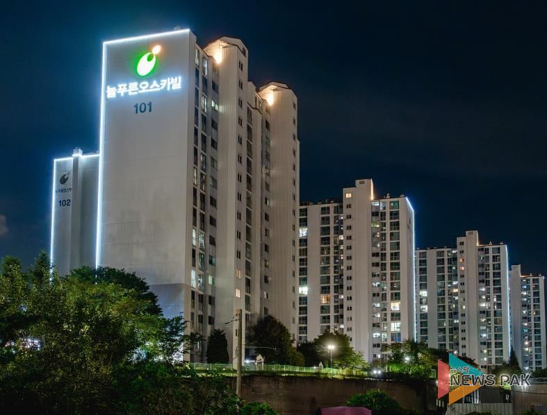 뉴스팍 이소율 기자 | 오산시 관내 아파트(공동주택) 단지들이 오색찬란한 빛으로 물들고 있다.