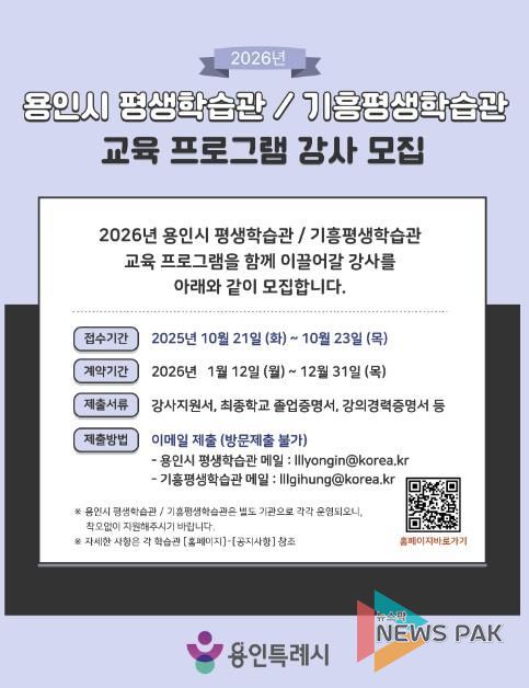 뉴스팍 배상미 기자 | 용인특례시는 21일부터 23일까지 3일간 ‘2026년 평생학습관 프로그램’을 운영할 강사를 모집한다고 15일 밝혔다.