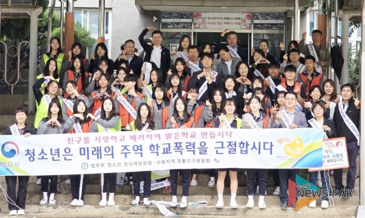 뉴스팍 배상미 기자 | 수원시 영통구는 14일 동수원중학교 정문에서 법무부 청소년범죄예방위원 수원지역 영통지구위원회(이하 ‘범방위’, 회장 이윤희)와 동수원중학교 재학생, 교직원, 학부모회 등 50여명이 참여하여 ‘등굣길 청소년 선도 캠페인’을 실시했다.